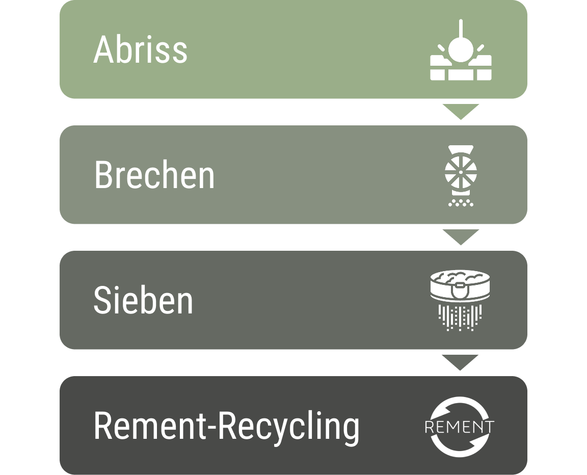 Rement-Anlagen lassen sich nahtlos in bestehende Wertschöpfungsketten für Betonrecycling integrieren. Wie bisher wird das Abbruchmaterial entweder vor Ort oder in einer stationären Anlage zerkleinert. Anschließend sollte das Material gesiebt werden, um es in verschiedene Korngrößen zu trennen.